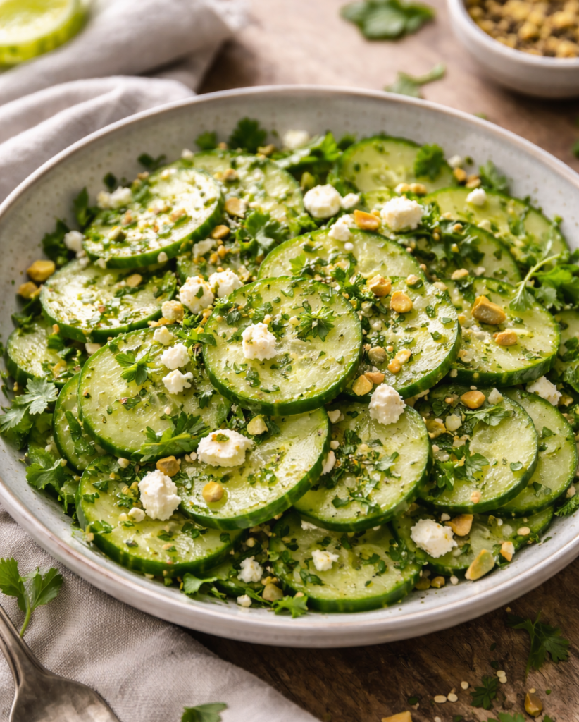 Light, crisp, and bursting with fresh flavors, this cucumber and herb salad is a celebration of simple, wholesome ingredients. Tender cucumber slices mingle with fragrant thyme, basil, and parsley, while salty feta and crunchy pistachios add richness and texture.